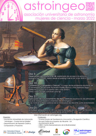 - Día 10: Conferencia: «Geógrafas y Ciencia», a cargo de las profesoras doctoras de la Universidad de Alicante Ascensión Padilla Blanco y Ana Espinosa Seguí. Politécnica IV aula 23 G planta cero, a las 20:00h.